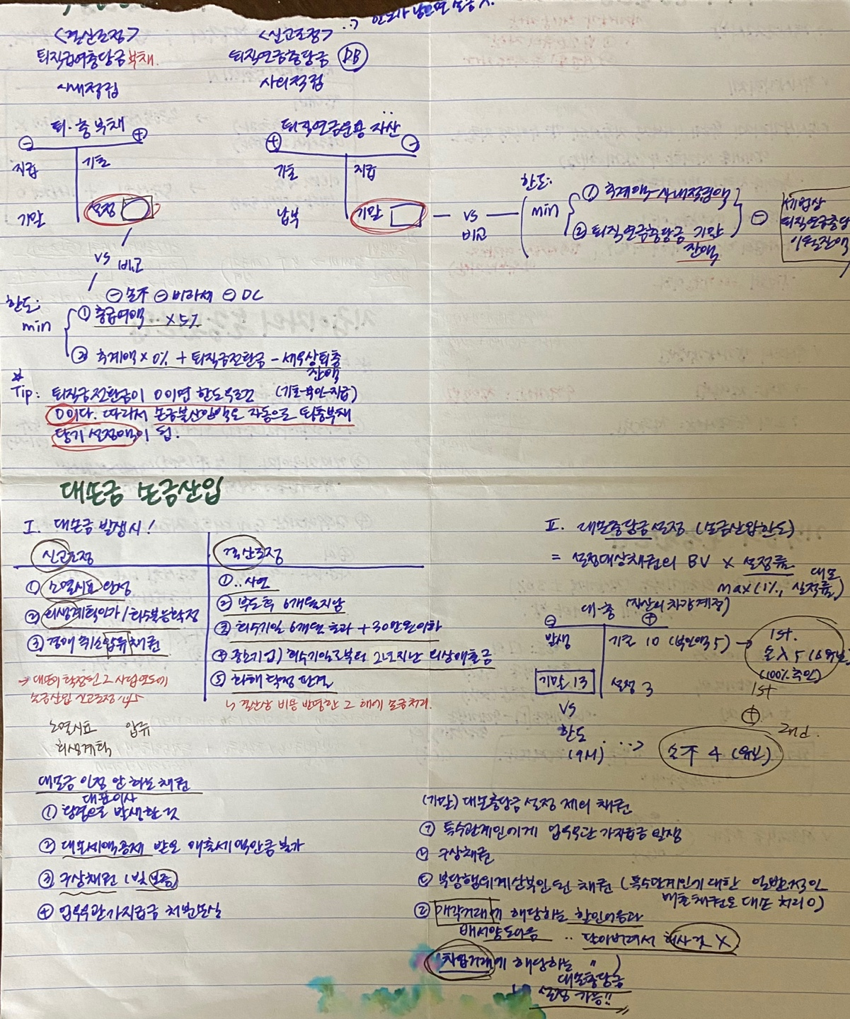 예를 하나 들자면 퇴직급여충당금 손금산입한도 / 퇴직연금충당금 손금산입한도 / 대손충당금 손금산입한도 이런 것들이 사실 다 다른 개념이지만, 너무 헷갈리고 머릿속에 둥둥 떠다녔는데, 최대한 이해하려 노력하면서 내 손으로 직접 정리하니까 저 이미지 그대로 내 머리에 기억되어서 써먹을 수 있었다. 당연히 저 종이에 있는 단어 하나하나 다 줄줄 읊을 만큼 기억했다는 건 아니다. 재경관리사는 서술형이 아니어서 그럴 필요도 없다. 그냥 저 개념들이 하나의 이미지로 박혀서 대손충당금은 전년도 한도 부인액을 전액 손금산입 한 다음에 당해년도 한도와 기말 대손충당금 잔액을 비교해서 손금산입을 한 번 더 해줘야 되는 이중 세무조정이 필요하구나. 이 정도로만 이해하고 있으면 된다. 이것도 내가 블로그에 설명하려고 굳이 말로 옮겨적은 것이지, 실제로 기억할 땐 1st. 손 入 5 (△ 유보) (100% 추인)만 떠올리고 논리체계를 대충 기억해내면 된다.